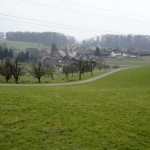 Vorbei an der alten Fabrik der Landert Motoren AG steigt der Weg durch typische Agglomerations-Wohnquartiere langsam an. Vorbei an Wohnblöcken aus den 60er Jahren, modernen Reiheneinfamilienhäusern (Typ Kaninchenstall) und Terrassenhäusern aus den 70er und 80er Jahren, folgt der Weg stetig der Strasse nach Nussbaumen. Ein kleiner Rebberg, mitten im Quartier, streckt trotzig seine braunen Äste der Sonne entgegen. Wir folgen der Strasse, lassen die letzten Häuserzeilen hinter uns und erblicken Nussbaumen.
