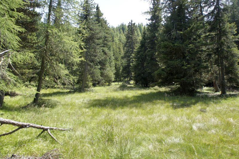 Vorbei an grossen Stallungen windet sich der Weg etwas oberhalb der Strasse durch prächtige Arven- und Lärchen-Wälder. Der Weg ist dick gepolstert mit abgeworfenen Nadeln. Stundenlang könnten wir so weiter gehen, aber unser Weg zum Aussichtspunkt Stand zweigt von diesem schönen Weg ab. Über sanfte Hügel schwingt sich der Weg aufwärts. Vorbei an Erika, Alpenblumen und etlichen Schmetterlingen werden knapp 100 Höhenmeter bezwungen.