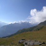 Nach viel Regen scheint die Sonne. Eine einzelne Wolke hängt am Ziel, dem Augstbordhorn. Die wird sich ja wohl auflösen bis ich oben bin. 2 3/4 Stunden Weg steht angeschlagen. Fast 1′000 Höhenmeter liegen vor mir. Vorbei am Restaurant Moosalp steigt der breite Weg locker an. So wird’s ein lockeres Unterfangen. Der Weg windet sich langsam hoch, gewinnt an Höhe. Ich durchquere eine friedlich grasende Kuh-Herde aus lauter Kampf-Kühen. Diese schwarzen, massigen Tiere machen gewaltig Eindruck, lassen sich durch mich aber überhaupt nicht stören.